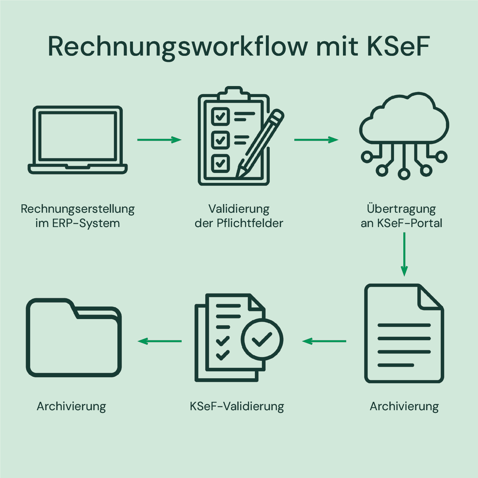 Sie fragen sich, wie ein typischer Rechnungsprozess mit KSeF aussieht? Die folgende Prozessgrafik zeigt den Ablauf Schritt für Schritt: