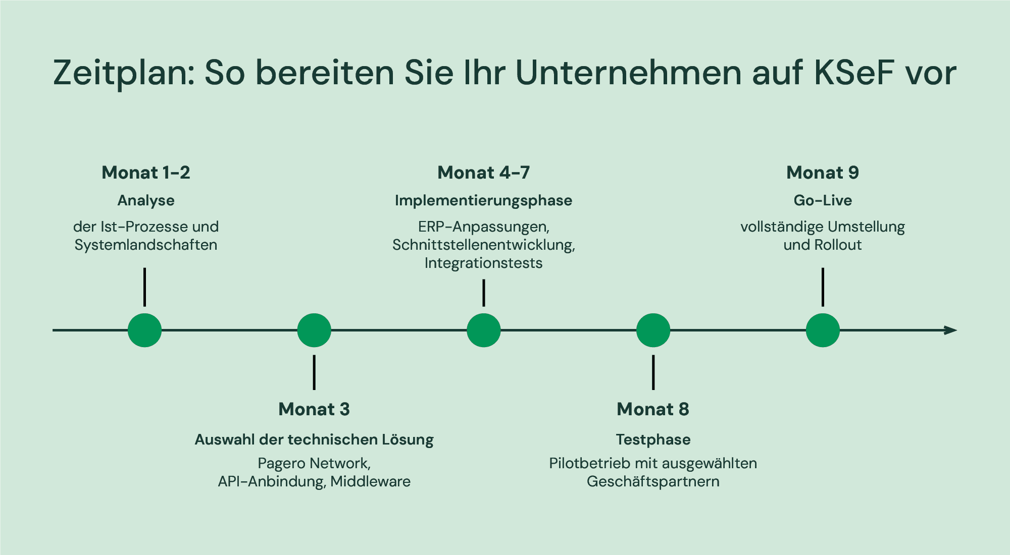 Insgesamt dauert die vollständige Vorbereitung auf KSeF erfahrungsgemäß sechs bis neun Monate, abhängig von der Komplexität der Unternehmensstruktur und der Systemlandschaft. Die nachfolgende Timeline hilft Ihnen, die notwendigen Schritte zu priorisieren und sicherzustellen, dass alle relevanten Bereiche im Unternehmen eingebunden werden.